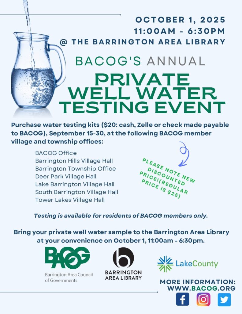 | Private well owners should test their well for bacteria and nitrates EVERY YEAR. In partnership with the Lake County Health Department and Barrington Area Library, BACOG hosts a Private Well Water Testing Event. Each year, staff from the Lake County Health Department comes to the BACOG community to collect water samples and answer questions. Additional BACOG Community Partners also will be on-site with information about their offerings. Water testing is provided for residents of BACOG communities who get their water from a private well. (If you are on municipal water, your water is maintained and already routinely tested according to IEPA guidelines.) For those on a private well, it is recommended that you test your water annually. This testing looks for contamination including Coliform Bacteria, E. Coli, and Nitrates. Typically, 14-17% of BACOG water samples have been found to be contaminated with bacteria. |
